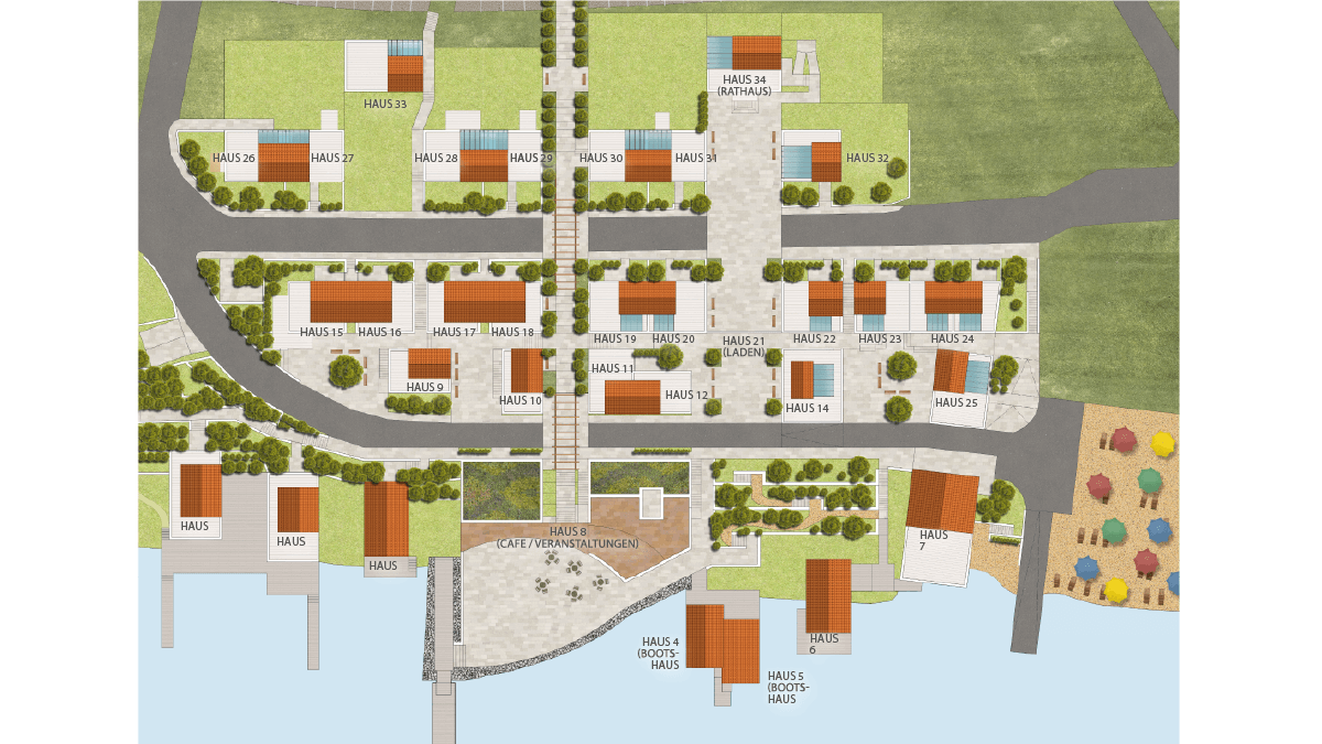 Durch die absichtliche Verdichtung gibt es keinen Raum für zu pflegende Gärten. Als private Rückzugsorte dienen die Dachterrassen, von denen aus man einen grandiosen Blick auf den See und die Umgebung hat. Idyllische Plätze, die Bootsstege im See und ein eigener Strand direkt an der Ostseite des Hafendorfs laden zum Bummeln und Verweilen ein.