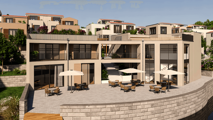 34 Häuser bilden auf einem Baufeld von ca. 10.000 qm mit 12 m Höhenunterschied ein pittoreskes einmaliges Hafendorf mit Südhanglage. Die südländisch anmutenden Häuser haben meist zwischen 90 und 170 qm Nutzfläche.