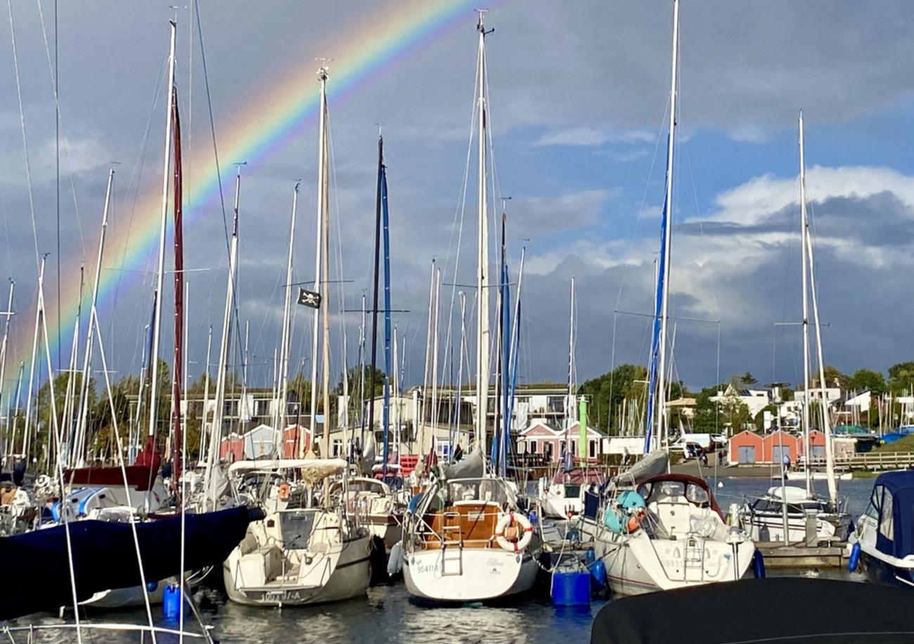 Hinter der bunten Hafenpromenade liegen die Jollen vor Wind geschützt auf ihrem Landliegeplatz. Auch Katamaranplätze am grünen Ufer südlich des Hafens sind im Angebot.