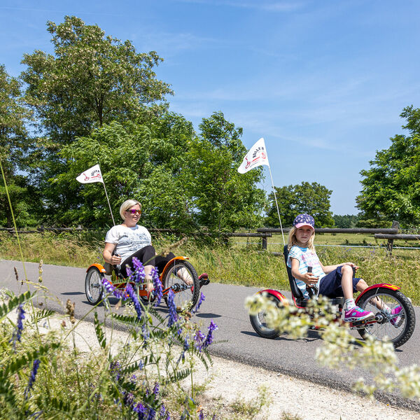 Unsere familienfreundlichen Tretmobile lassen Jung und Alt gemeinsam in die Pedale treten und den asphaltierten, elf Kilometer langen Rundweg um den Cospudener See meistern. Dabei können Sie Bisons und Rotwild beobachten, einen wunderbaren Blick vom Aussichtsturm auf der Bistumshöhe genießen oder eine Picknick- und Badepause einlegen.