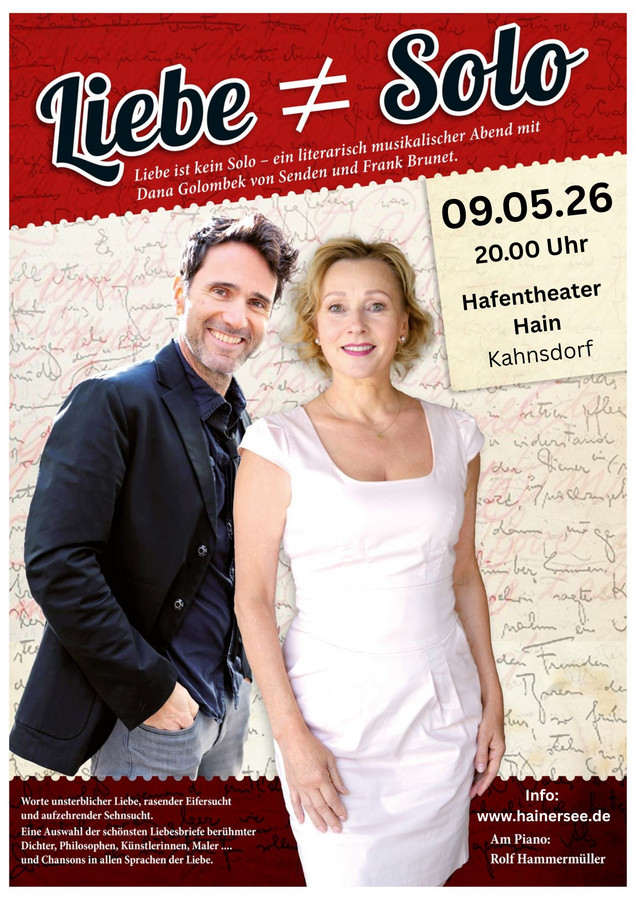 Kaum etwas bewegt uns so sehr wie ein in Worte gefasstes Liebesgeständnis. Eine Auswahl der schönsten Liebesbriefe von Katharina der Großen über Frida Kahlo, Camille Claudel, Auguste Rodin, Erich Maria Remarque, Sarah Bernhard, Oscar Wilde, Berthold Brecht, Anais Nin ... gewürzt mit Geschichten amouröser Abenteuer und umspielt mit wunderbaren Chansons in deutscher, italienischer, französischer, spanischer und russischer Sprache erwartet Sie an diesem liebevollen Abend! Es ist das Nachfolgeprogramm von „Schreiben Sie mir oder ich sterbe“, welches 2024 im Hafentheater gastierte.